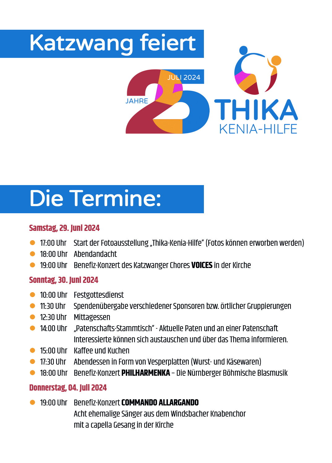 In den letzten 25 Jahren haben wir mit Ihrer Unterstützung etwas Großes vollbracht. Eine gemeinsame, tragfähige und beständige Brücke der Nächstenliebe wurde nach Thika in Kenia aufgebaut. Dies möchten wir gerne mit Ihnen zusammen feiern.